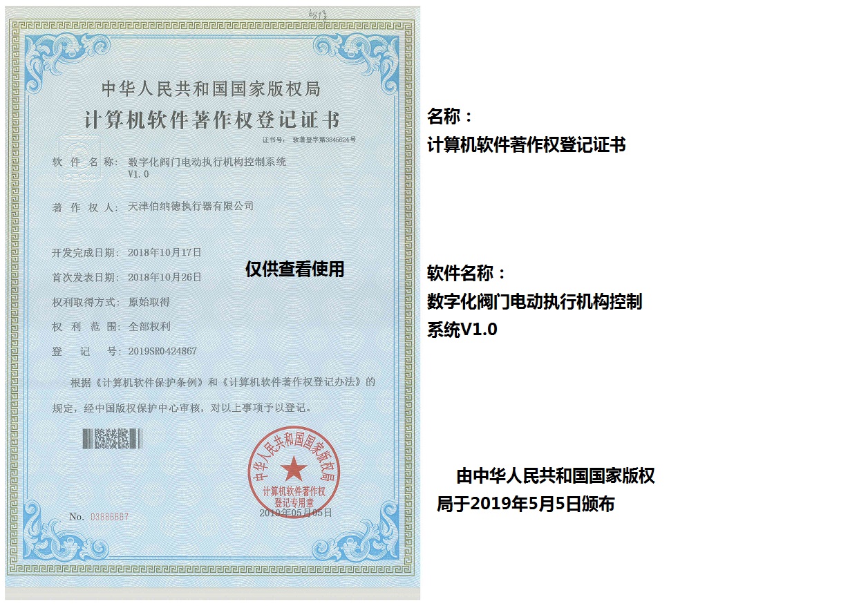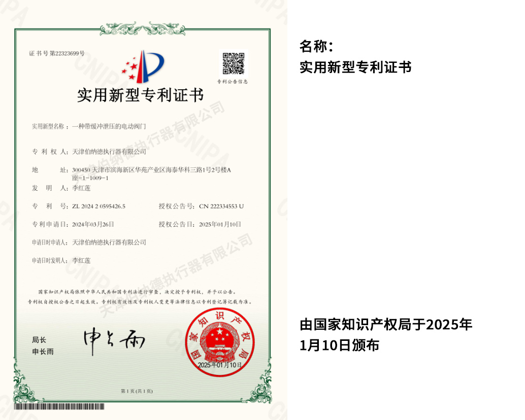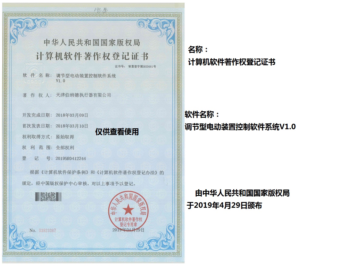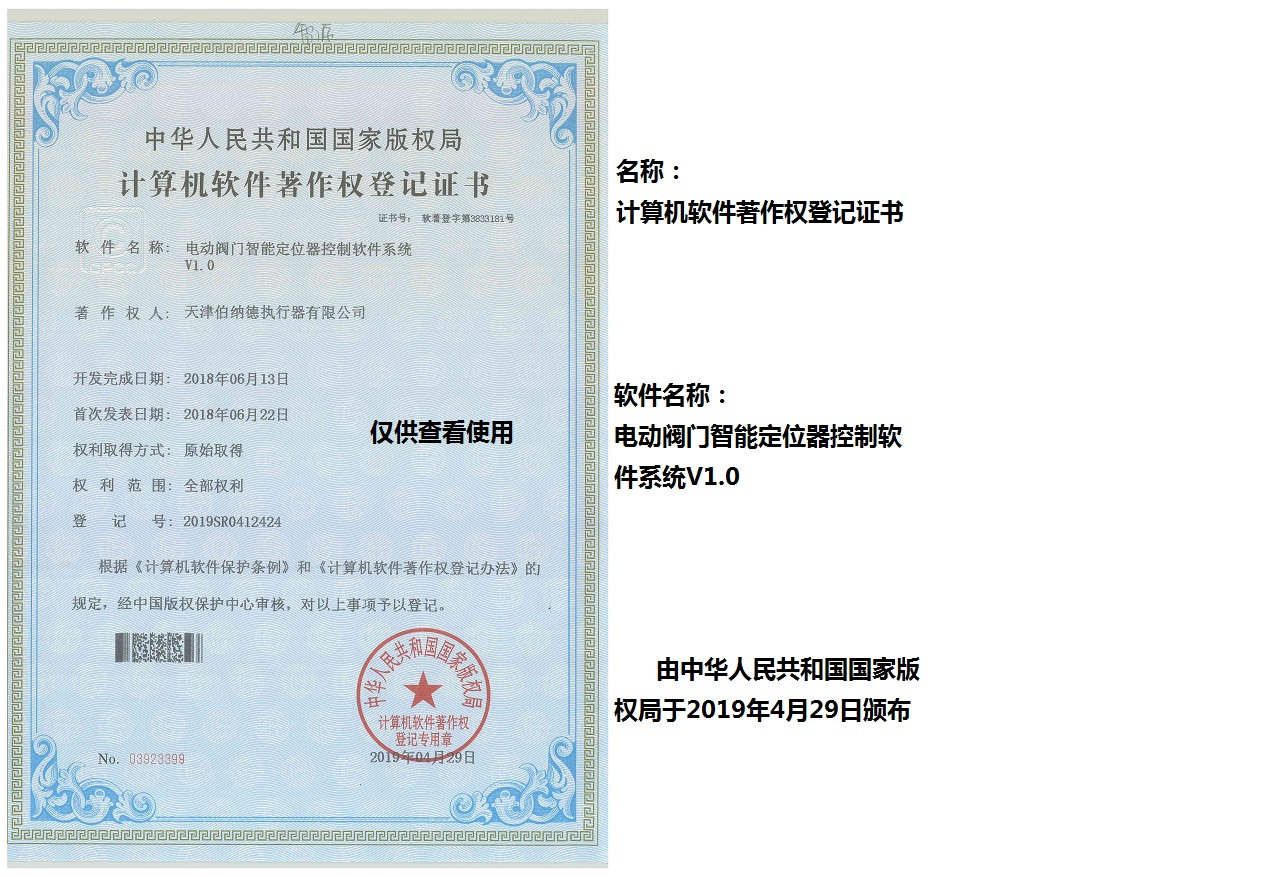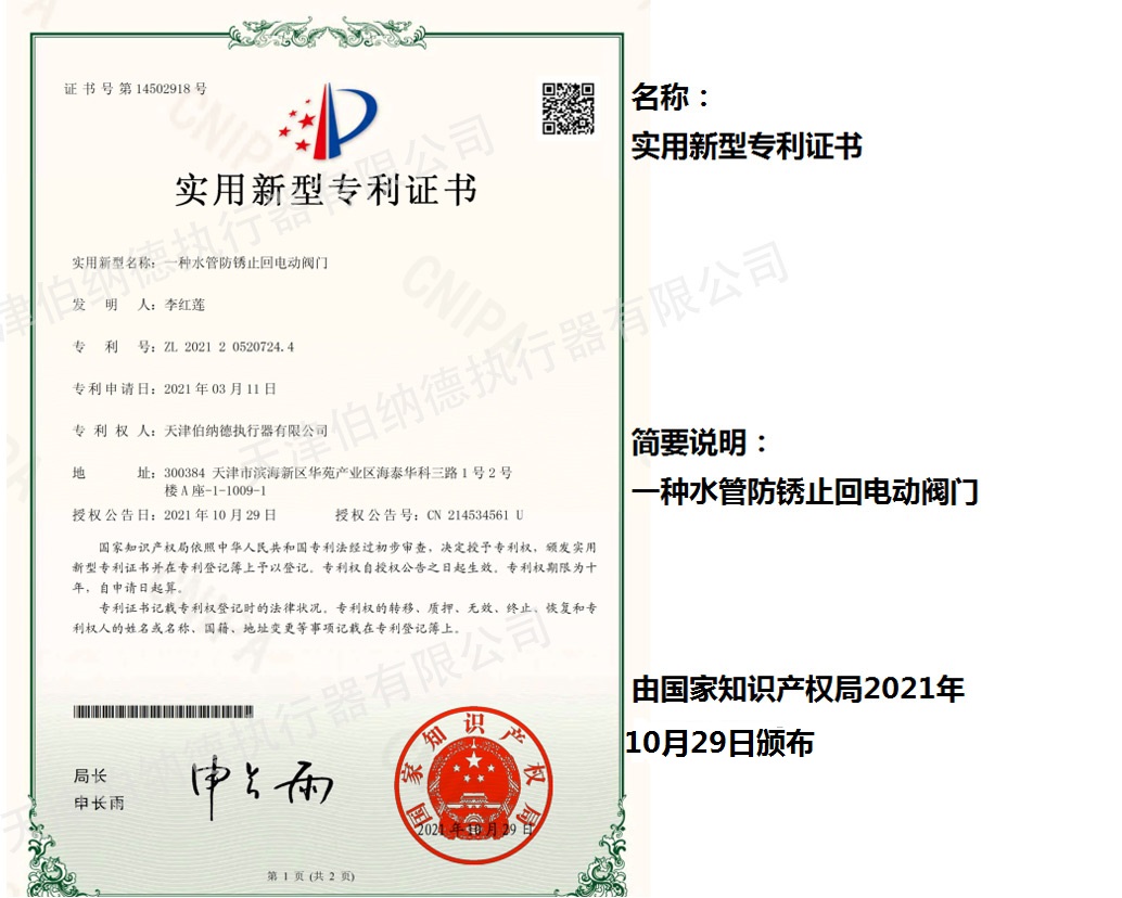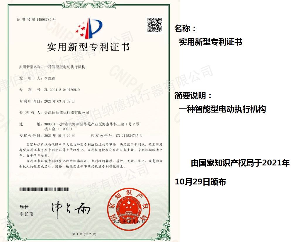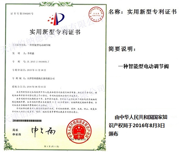 天津伯納德是生產電動執行機構的制造企業,擁有自身的專利和技術研發團隊,擁有過多項專利,榮獲“溫控式電動執行器實用新型專利證書”、“整體式電動閥門裝置實用新型專利證書”、“防爆型閥門電動裝置實用新型專利證書”、“智能型電動執行器實用新型專利證書”、“智能型電動調節閥實用新型專利證書”等專利證書。 天津伯納德生產的智能型電動執行機構,使用數字集成芯片,可選配全中文菜單操作和顯示、智能、人性化的機電一體的結構設計,免開蓋紅外線遙控器設定造就了其完善的功能、輕巧美觀、調試簡單、操作方便、中文菜單智能顯示簡單明了、可靠,充分保護,具有其完善的保護功能。