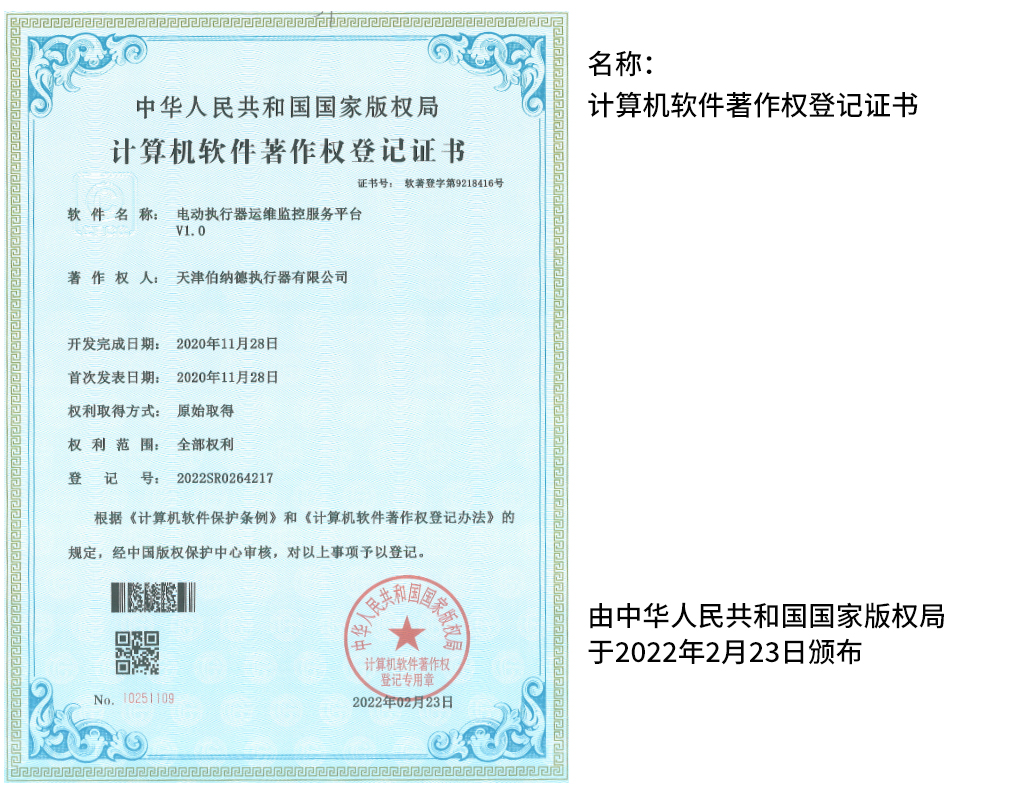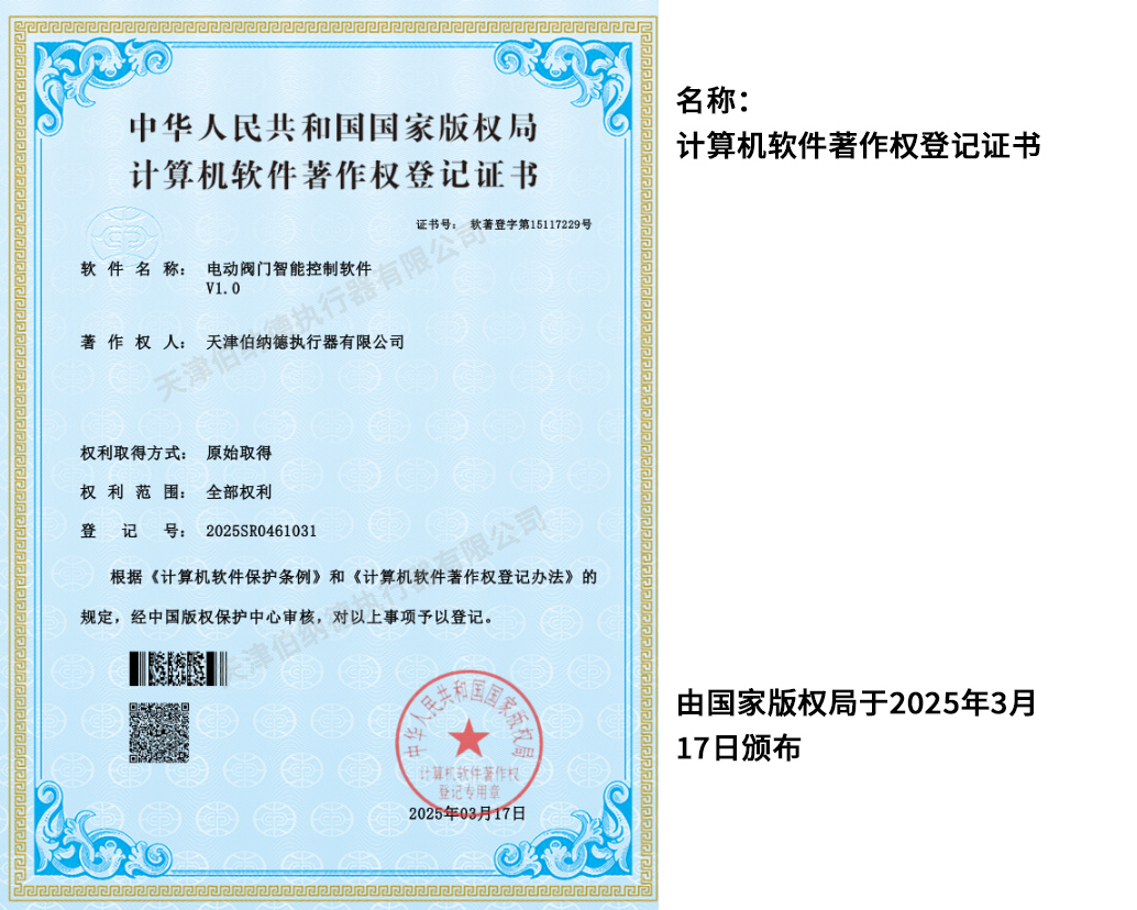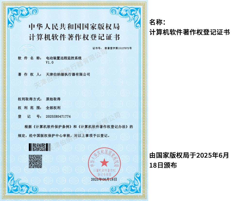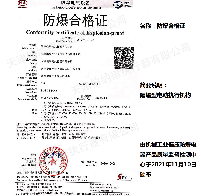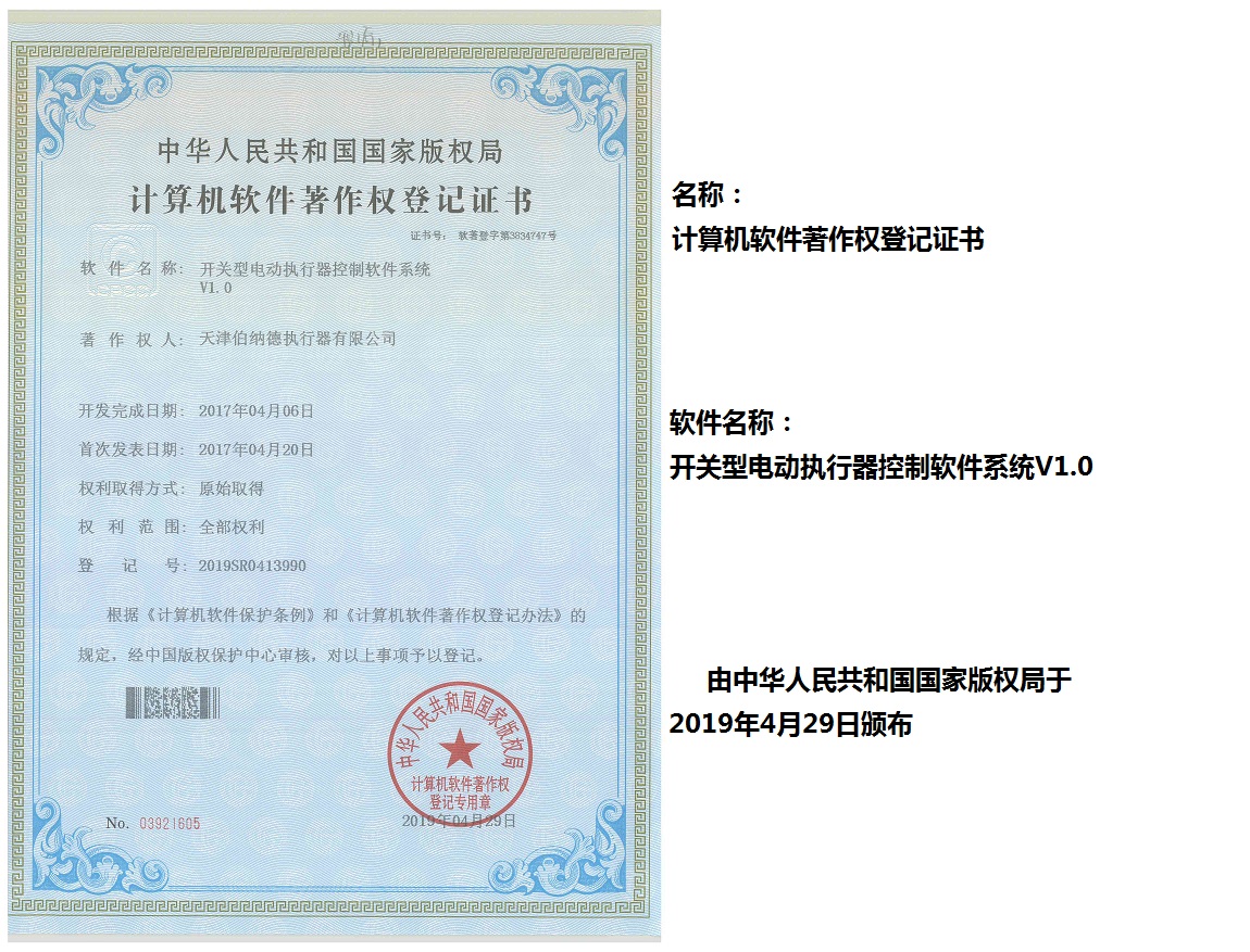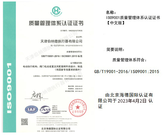 天津伯納德擁有技術人才和管理人才,是集智能型電動執行機構的研究開發、生產制造、銷售、安裝調試于一體的公司。天津伯納德堅持質量管理,不斷完善質量管理體系確保產品質量,提供售前售后服務,榮獲“ISO9001:2015質量管理體系認證證書”,歐盟市場認證產品的“C E認證證書”,及俄羅斯認證產品的“E A C認證證書”。